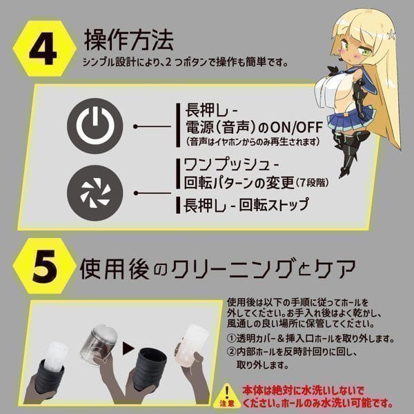 Le device intègre aussi des voix ecchi qui s’activent pendant ton utilisation, interprétées par Mirai Soyokaze, pour te plonger dans une ambiance coquine et excitante qui murmure à ton oreille tandis que le jouet aspire ta queue avec avidité. Pour recharger, utilise le chargeur USB-A inclus : il faut 2 heures pour une charge complète, offrant jusqu’à 35 minutes d’utilisation continue. Nettoie en retirant la partie onahole du device, essuie-la ou utilise un kit d’entretien dédié, puis sèche-la avant de la remettre en place. Et n’oublie pas : retire le device du chargeur une fois qu’il est plein, pour éviter toute surchauffe – idéal pour les fans de sensations X-ray intenses !